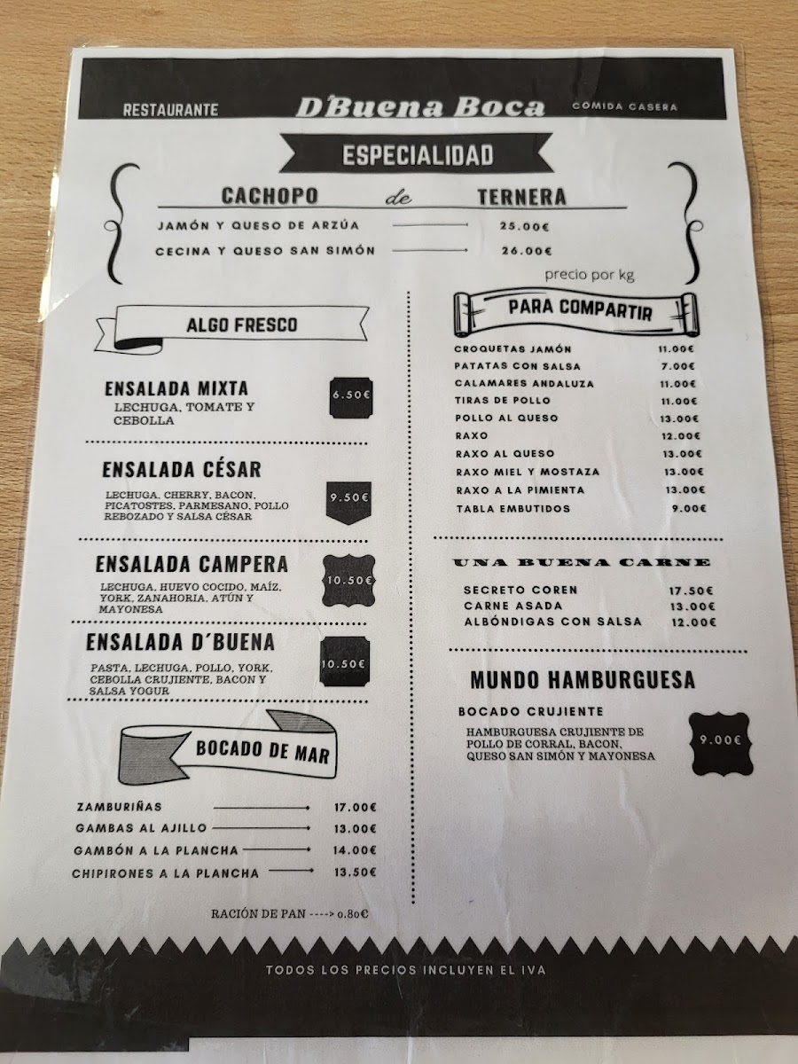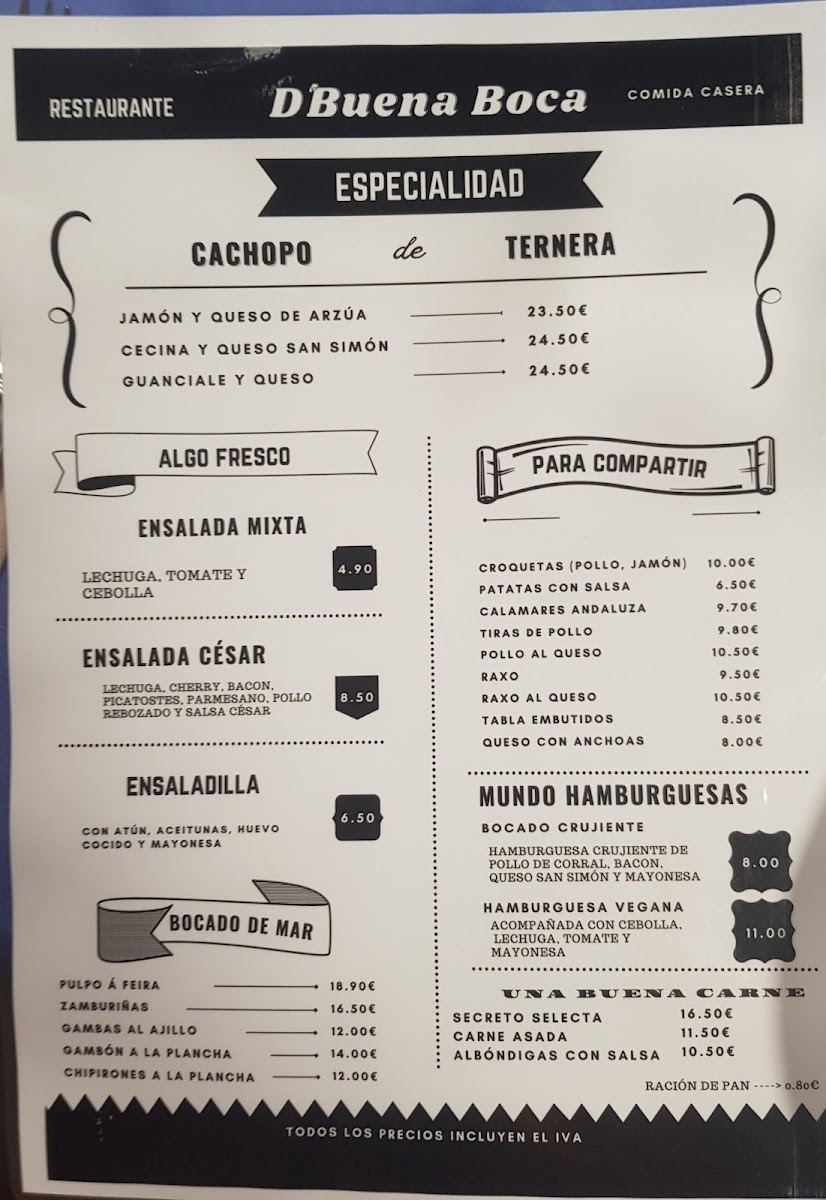 The menu at D’buena Boca feels like a well-rounded snapshot of Galician comfort food, balancing hearty mains, classic tapas, and satisfying desserts. Dishes such as Cachopo de Jamón Con Queixo Arzúa and Raxo Con Patatas highlight the kitchen’s focus on generous portions and bold, familiar flavors, while seafood lovers are well catered for with Pulpo A la Gallega, Zamburiñas, Chipirones A la Plancha, and Gambones A la Plancha, all prepared in a straightforward style that lets the ingredients shine. Fried options like Calamares A la Andaluza Con Patatas and Croquetas de Jamón Con Patatas add a comforting, shareable element to the menu, ideal alongside Unas Cervezas Con Un Buen Pincho. For something more casual, Hamburguesa Bocado Crujiente, Meatballs, and Raxo Con Queso bring variety without straying from the restaurant’s rustic identity. Lighter choices such as Ensalada de Lechuga Y Tomate and Ensaladilla Rusa provide balance, while desserts including Brownie de Chocolate Blanco, Brownie Con Helado, Coulant de Chocolate Con Helado, and Tarta Lotus close the experience on a rich, indulgent note. A simple Café rounds things off nicely, reinforcing the impression of a menu designed for relaxed, satisfying meals rather than culinary theatrics.